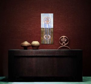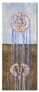 Der Kontrast der verschiedenen Materialien verstärkt die optische Wirkung des Kunstwerks. Die bei Trocknung aufgerissenen Strukturen und Lasuren verleihen dem Objekt einen sehr plastischen Eindruck und je nach Lichteinfall besondere Effekte. Das ausdrucksstarke Wandbild ist von mir auf der Rückseite signiert und datiert. Alle verwenden Materialien wurden von mir auf eine Leinwand aufgetragen diese ist auf einen Holzkeilrahmen aufgezogen. Die Seitenränder sind mit bemalt somit können Sie das Gemälde gleich fertig aufhängen.